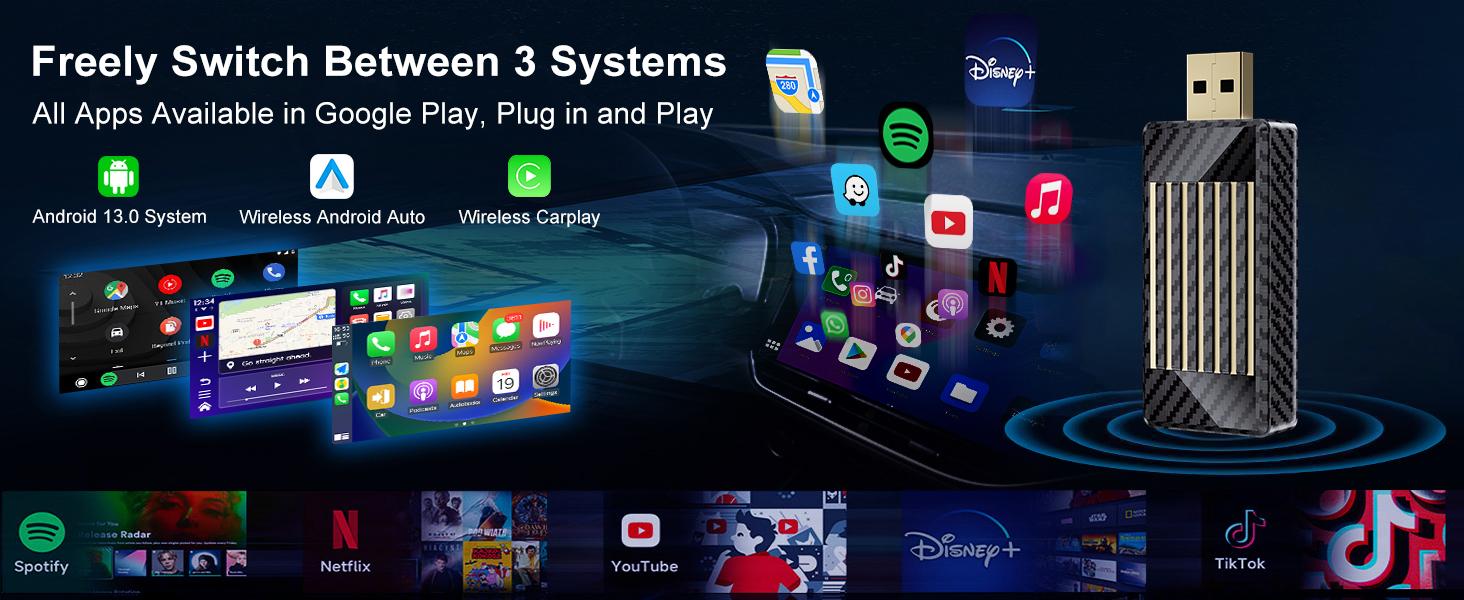 Built-in Netflix and Youtube/Tiktok/google play - Wireless car play dongle for iphone apple has built-in Netflix and Youtube, it can play all kinds of interesting videos, so that you are not bored while driving. In addition, the wireless CarPlay adapter has a built-in Wi-Fi Bluetooth module, it can quickly identify and automatically connect to your phone.