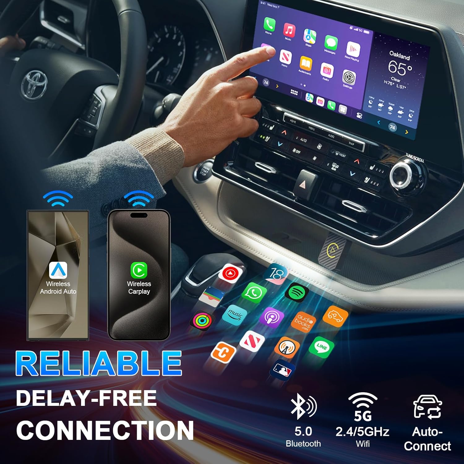 L'adaptateur CarPlay sans fil 2 en 1 présente une conception petite et compacte qui permet au dongle CarPlay sans fil de s'intégrer parfaitement à l'intérieur de la voiture, au Wi-Fi 2,4/5 GHz intégré, au Bluetooth 5.0 avec puce intelligente améliorée. Le démarrage est ultra rapide sans délai. La connexion est stable et fiable, avec peu de retards et de problèmes de connectivité pendant la connexion. L'adaptateur CarPlay et Android Auto sans fil 2 en 1 maintient un signal fort même dans des situations qui peuvent interférer avec le signal, comme les parkings souterrains ou les environnements métropolitains surpeuplés.